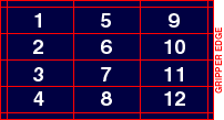 | SUPER 4/RC: Print cards on a strip of stock 3.5" wide. Typeset cards so that up to a 3/8" gripper edge is left at the top and 1/8" trim at the bottom. Cards are placed in feed section and friction fed onto alignment table. After being registered, cards are then conveyed into knives, where they exit into the separators arms. Finally, cards are delivered neatly onto a slow moving fan out section. | SUPER 12/RC: Run 12 up cards on 8/5" x 11" stock. The first pass trims the outside perimeters and cuts the stock into three 8.5" x 3.5" strips. The operator then transfers 8.5" x 3.5" stock onto the 4-up side of the slitter, cutting up to 144,000 business cards per hour. Both feeders can be operated simultaneously. |